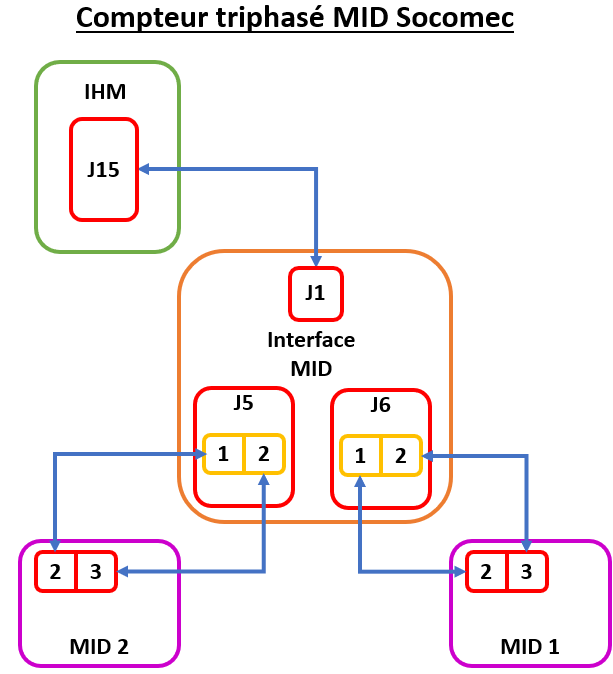 Le compteur MID 1, associée au PDC 1 et le MID 2 pour le PDC 2 sont tout deux connectés à une carte interface MID permettant la communication des compteurs avec l'IHM.
